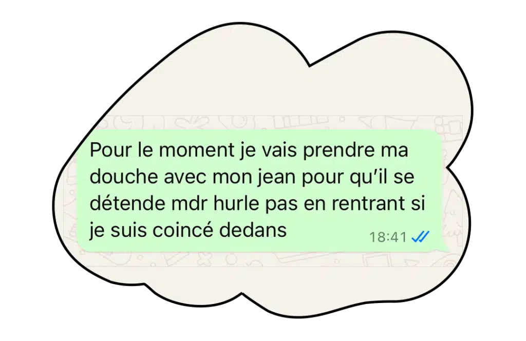 Alors, comme beaucoup d’entre nous, j’ai eu ce réflexe : je suis allée voir ce que TikTok pouvait bien me conseiller. Et là, je tombe sur cette astuce devenue virale : prendre une douche chaude en portant le pantalon pour le détendre naturellement. Oui, oui, sous la douche, toute habillée !
