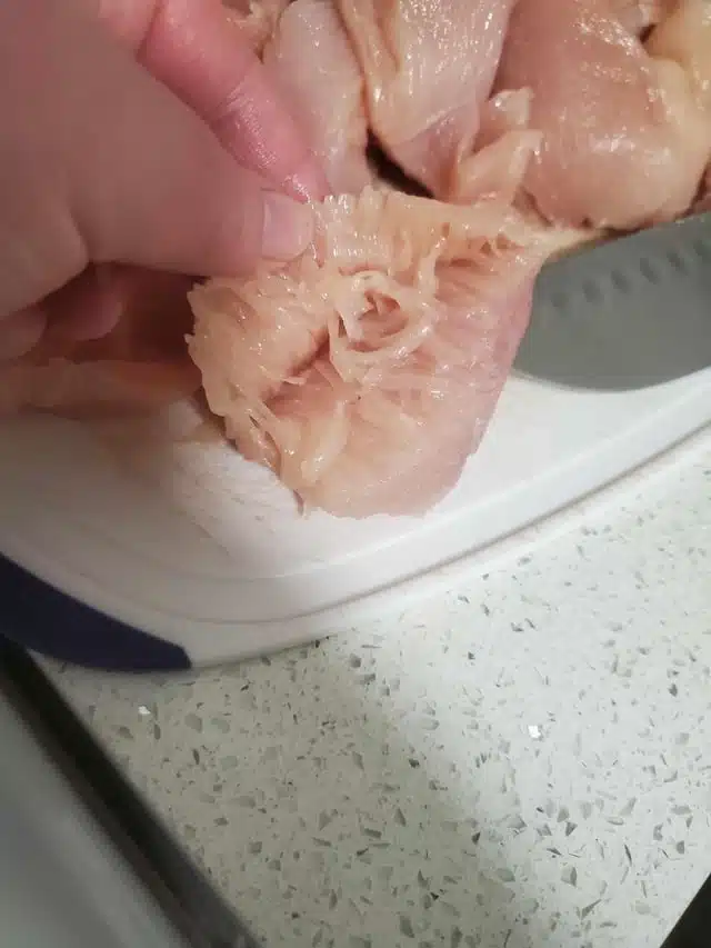 Imaginez-vous préparer tranquillement le repas du soir quand soudain, le morceau de poulet que vous découpez se met à se désagréger en filaments qui ressemblent étrangement à des spaghettis. C’est exactement ce qui est arrivé à une mère de famille qui, stupéfaite, a partagé sa découverte sur les réseaux sociaux, déclenchant un véritable débat sur la qualité de la viande que nous consommons aujourd’hui.