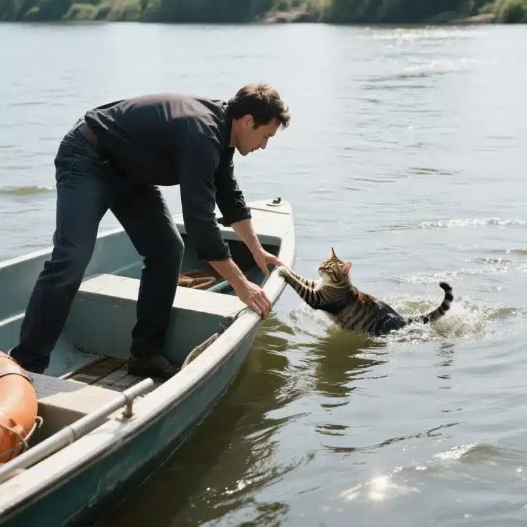 Le pauvre animal était épuisé et nageait difficilement vers eux. Victor décida immédiatement de laisser tomber la pêche pour lui venir en aide. Malgré la panique du chat qui griffait et se débattait, ils réussirent à le monter à bord et à le réchauffer.